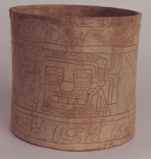 Vaso de pared recta, borde redondeado, base plana. Decoración: inciso medio, abajo del borde diseños de posibles glifos, los cuales se repiten cerca de la base. El diseño principal es un rostro antropomorfo, con cejas cuadradas, diseños incisos de círculos, los ojos posiblemente muestren un glifo, nariz redonda, boca cabierta en la cual se aprecian…