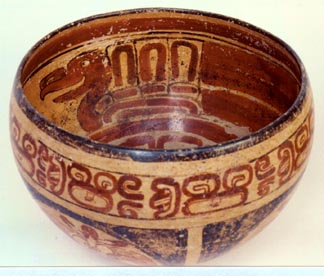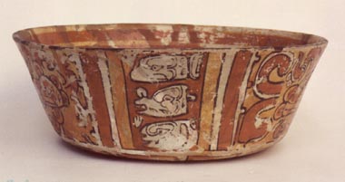 Cuenco de pared curvo convergente, base plana, borde redondeado. Decoración: borde pintado de negro, abajo del borde una banda de pseudoglifos pintados en rojo, enmarcados por dos líneas negras una arriba y una abajo. Diseño principal: cuatro páneles con diseños abstractos en rojo, sobre un fondo naranja, alrededor del diseño pintado en negro, en la…