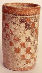 Vaso de pared recta, base plana, borde redondeado. Decoración: una banda roja abajo del borde. Diseño principal: cuadros en rojo, negro y blanco alrededor de la pared, formando bandas diagonales por color. No. 0882 de Bishop y Reents-Budet, 1991. Reporte sobre Análisis por Activación de Neutrones.