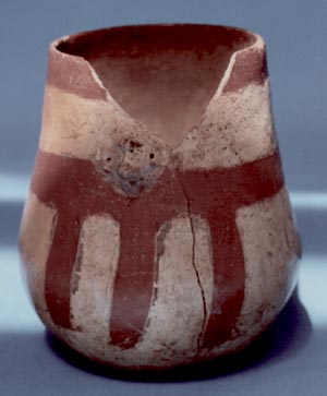 Tecomate de pared curvo convergente, base convexa, borde redondeado. Decoración: borde pintado de rojo, abajo del borde un diseño zoomorfo en relieve, abajo de él una banda roja horizontal, de la cual salen 6 bandas rojas separadas equidistantemente.