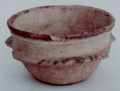 Cuenco de pared recto divergente, base plana, borde redondeado. Decoración: borde pintado de rojo, pestaña medial con diseños en rojo.
