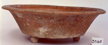 Plato de pared recto divergente, borde redondeado, base trípode. Decoración: soportes cónicos, sobre el borde diseños en naranja y negro, abajo del borde una acanaladura en la pared interior.