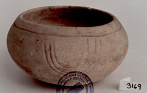 Cuenco de pared curvo convergente, base plana, borde redondeado. Decoración: abajo del borde una línea en inciso medio, sobre las paredes dos diseños en “U” formado por tres líneas en inciso medio. Los diseños se encuentran separados equidistantemente.