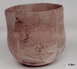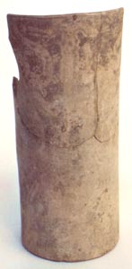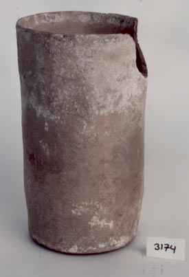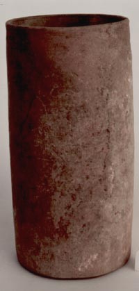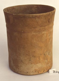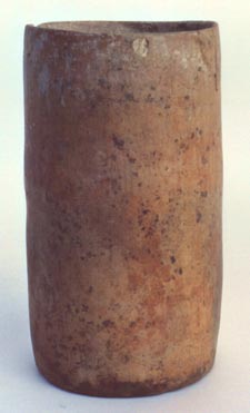 Vaso de pared recta, base plana, borde redondeado. Decoración: evidencia de estuco. Donación: Dr. Guillermo Mata, 25 de Julio de 1980.
