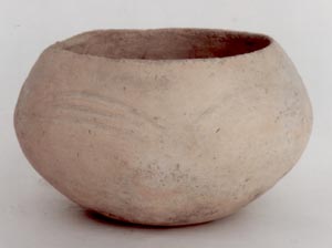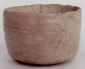 Cuenco de pared recta, base plana, borde redondeado. Decoración: una acanaladura abajo del borde, con evidencia de alisamiento.