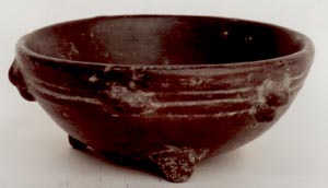Cuenco de pared curvo, base trípode, borde redondeado. Decoración: seis aplicaciones protuberantes alrededor del cuerpo, dos acanaladuras entre cada protuberancia, soportes cónicos.