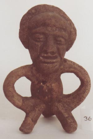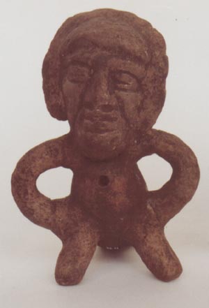 Figurilla antropomorfa con las manos sobre la cintura, tocado en forma de cabello colocho. Presenta un soporte en la parte de atrás.