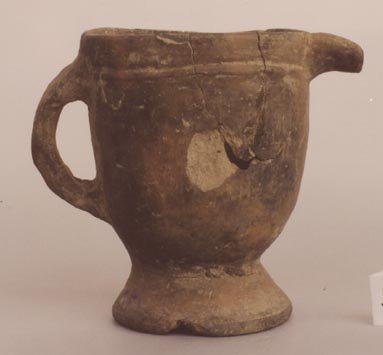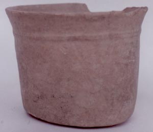 Cuenco de pared recto divergente, base pedestal, borde plano. Decoración: una asa y diseños en forma de púas alrededor del cuerpo.