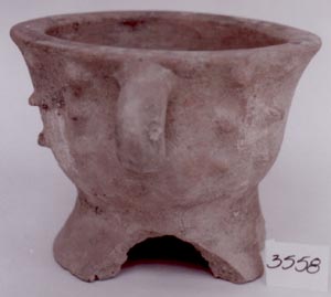 Cuenco de pared curvo divergente, base trípode, borde redondeado. Decoración: diseños en forma de triángulos ashurados abajo del borde en inciso fino, soportes cónicos.
