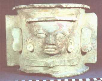 Urna funeraria, de pared recta, base pedestal, borde evertido. Decoración: rostro antropomorfo en relieve, orejeras, una pestaña sobre la frente, abajo de la quijada un diseño en forma de corbata de mariposa, dos asas de cada lado, las primeras dos son pequeñas con una ondulación en el centro, las otras dos en forma de aleta,…