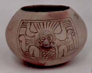 Tecomate de pared curvo convergente, base plana, borde agudo. Decoración: dos páneles con diseño zoomorfo, presentan la efigie de un mono, con el rostro del mono en relieve, el cuerpo en diseño inciso, las patas a los lados, manos hacia arriba.
