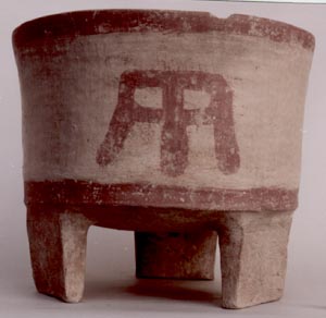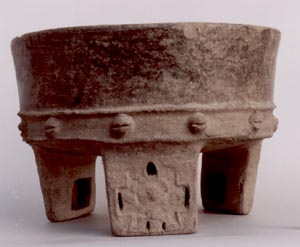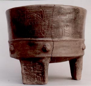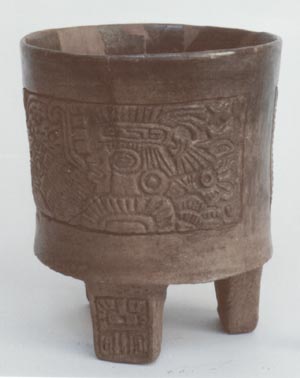 Cuenco de pared recta, borde agudo, base trípode. Decoración: dos páneles en bajo relieve, con el diseño de un personaje de cuya boca sale una voluta. En las manos parece llevar la cabeza de un ave, lleva tocado alto y muy elaborado, soportes rectangulares con sonaja y diseños en bajo relieve. No. 0888 de Bishop…