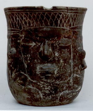 Vaso de pared ligeramente curvo divergente, base plana, borde redondeado. Decoración: abajo del borde dos líneas incisas, abajo de ellas, alrededor de la pieza, un diseño inciso ashurado. Diseño principal: rostro antropomorfo, con los ojos en forma de grano de café, al igual que la boca. El rostro se encuentra enmarcado por una línea incisa;…
