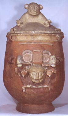 Urna de pared curvo convergente, borde plano, base pedestal. Decoración: abajo del borde cuatro asas y cuatro asas en el cuerpo. Diseño principal: rostro de un monstruo con las fauces abiertas, los ojos con un diseño de bastón, de las fauces del monstruo sale un jaguar. La tapadera tiene un diseño en relieve de un…