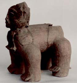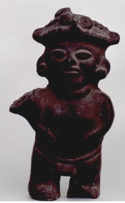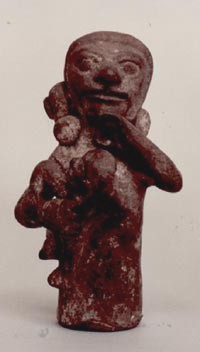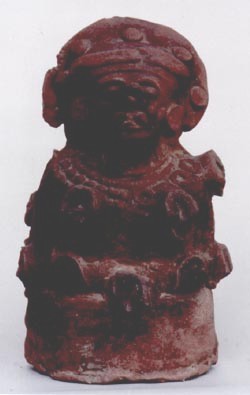 Figurilla femenina. Decoración: posiblemente estuvo decorada con diseños de frutos de cacao, ya que aún se encuentran las bases. LLeva collar, orejeras, tocado con diseños de pastillaje, y en la espalda un diseño de posible candelero. A cada costado lleva la figura de un niño.
