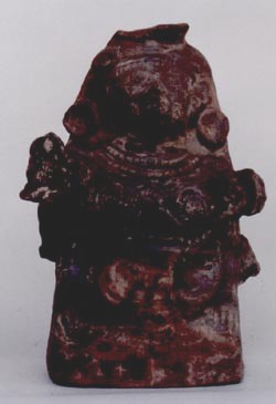 Figura zooantropomorfa. El cuerpo es de un animal de cuatro patas, bastante obeso, en el cuello lleva una especie de cascabeles, las cuales cuelgan de un diseño redondo en azul. El rostro es antropomorfo; la figura es hueca.