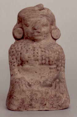 Figurilla feminina sentada con las manos apoyadas sobre las rodillas. Decoración: orejeras, tocado de trenza, la mitad derecha del cuerpo presenta un diseño de círculos con un agujero en el centro; el lado izquierdo tiene diseños en forma de pastillaje.