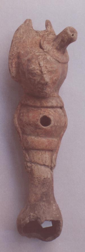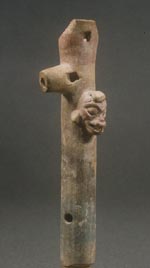 Flauta tubular, con diseños de rostro zoomorfo en relieve. En la parte superior presenta un diseño de falsa boquilla. La boquilla se encuentra a un lado del rostro, y el agujero de salida en ese mismo lado, en la parte inferior.
