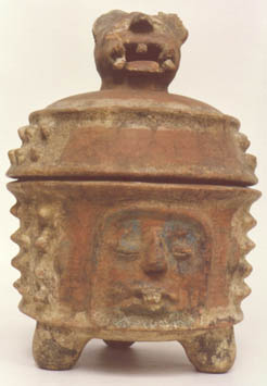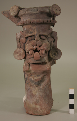 Incensario tubular. Decoración: diseños zoomorfos mounstrosos. De la boca salen 4 colmillos. Lleva orejeras, asas en forma de aletas, tocado alto con la técnica de pastillaje.