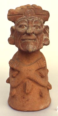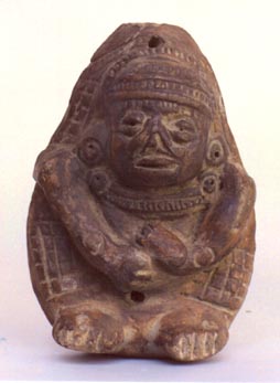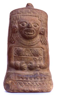 Figurilla antropomorfa, posiblemente emergiendo de algún fruto. Decoración: collar, orejeras, tocado en forma de gorro, manos sobre el vientre. La parte de atrás de la figura en cóncava, su función sonaja.
