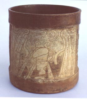 Vaso de pared recta, borde engrosado, base plana. Decoración: 4 páneles, 1) diseño de un personaje inciso, de pie con las manos y piernas entrecruzadas, tocado largo, de la boca parece salir un diseño en forma de cruz, el personaje se encuentra enmedio de dos cortinas, con un fondo blanco; 2) este pánel presenta un…