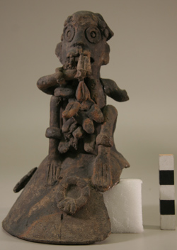 Tapadera de incensario. Decoración: personaje zooantropmorfo, sentado, comiendo frutos, de los cuales se encuentra rodeado. A los lados de la tapadera se aprecian diseños circulares.