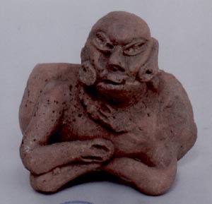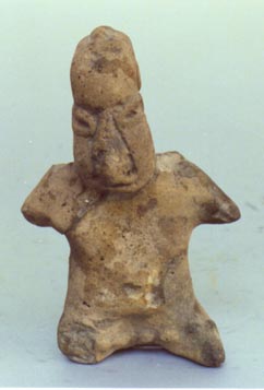 Figurilla antropomorfa, personaje sentado, cabeza aplanada de los lados, ojos alargados. No presenta ningún tipo de decoración.
