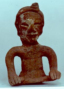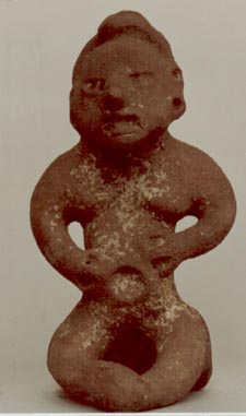 Figurilla antropomorfa, personaje sentado con las piernas alargadas al frente, manos sobre la cintura, tocado en forma de copete. El personaje muestra un gran ombligo.