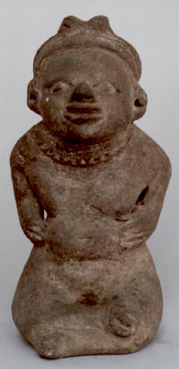 Figurilla antropomorfa, personaje sentado, con las manos sobre las rodillas, ojos alargados, dos agujeros en las orejas, tocado en forma de trenza.