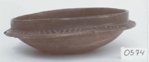 Plato de pared curvo convergente, base plana, borde redondeado. Decoración: pestaña medial, con diseños en inciso medio, de líneas diagonales.
