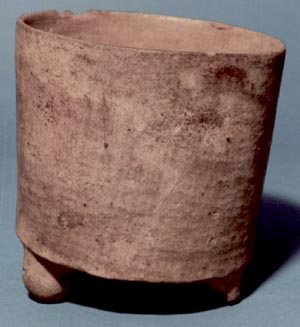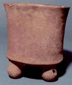 Vaso de pared recta, borde redondeado, base trípode. Soportes esféricos con ranura y sonaja. No presenta decoración.