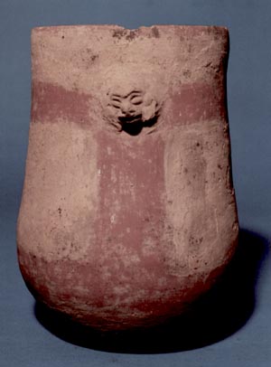 Vaso de pared curvo convergente, borde redondeado, base ligeramente cóncava. Decoración: borde pintado de rojo, rostro zoomorfo, posiblemente un mono del cual sale una banda roja la cual da la vuelta a la pared. Del rostro hacia abajo sale otra banda roja, que se une con otra cerca de la base, la cual es parecida…