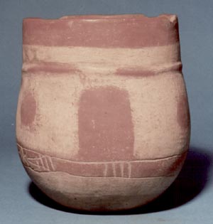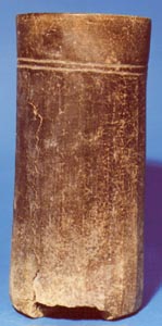 Vaso de pared recta, borde redondeado, base plana. Decoración: molduras verticales alrededor de la pared, abajo del borde dos líneas incisas medias.