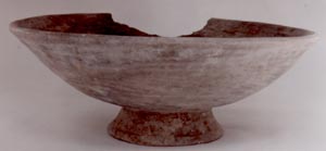 Cuenco de pared curvo divergente, base pedestal, borde redondeado. Decoración: restos de pintura blanca.