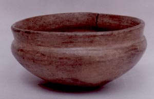 Cuenco de pared curvo convergente, base plana, borde redondeado. Decoración: presenta un cuello corto.