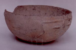 Cuenco de pared curvo convergente, base plana, borde redondeado. Decoración: rostro antropomorfo, ojos y nariz, un diseño en relieve que forma las cejas y parte de las mejías.