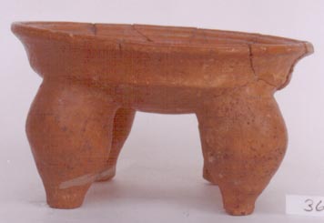 Plato de pared curvo divergente, base tetrápode, borde redondeado. Decoración: cuatro soportes mamiformes.