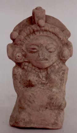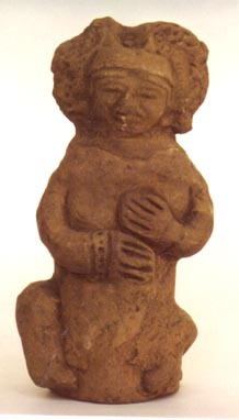 Figurilla femenina, sentada, con las manos sobre el pecho, tocado alto. El personaje parece estar sentado sobre un objeto.