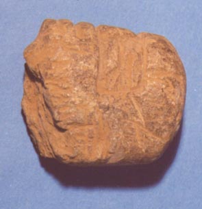 Personaje antropomorfo con las manos sobre el vientre, piernas flexionadas. Sobre la cabeza parece llevar un casco.