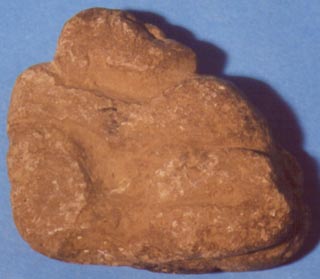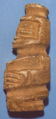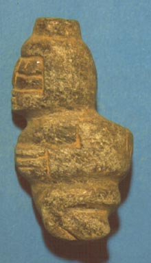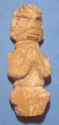 Personaje hincado con las manos sobre el vientre, rostro inciso. En la espalda lleva una concavidad.