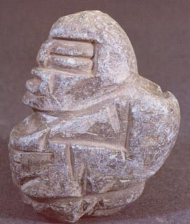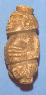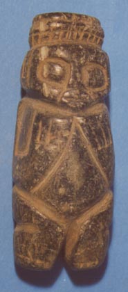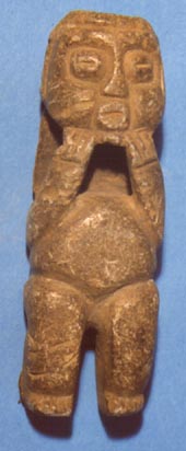 Personaje con la espalda protuberante, ojos en forma de granos de café, manos sobre el vientre. Al frente de la cabeza se forma una depresión.