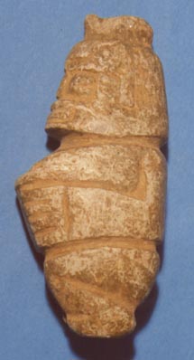 Personaje antropomorfo, con los ojos cuadrados. Las partes son representadas por un inciso. Tocado en forma de sombrero.