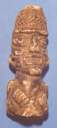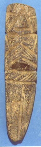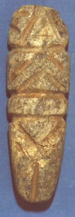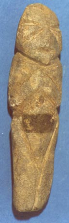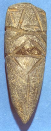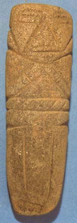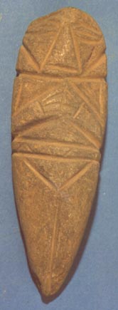 Camahuil antropomorfo con diseños incisos, ojos en forma de granos de café, manos sobre el pecho. Tiene forma de cuchillo.