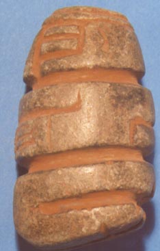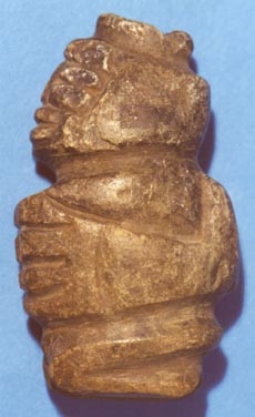 Personaje hincado, con las manos sobre el vientre, ojos en forma de granos de café. Entre cada inciso tiene cinabrio.