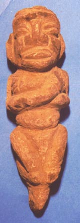 Figurilla antropomorfa, de ojos alargados, boca abierta, manos sobre el pecho. En las orejas lleva orificios para orejeras. Tocado en forma de chevrones.