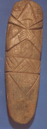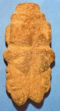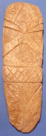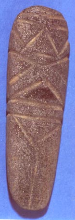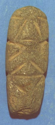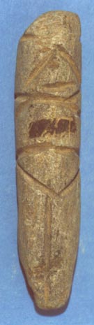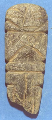 Camahuil antropomorfo tallado en piedra micácea. Técnica: tallado, inciso. Lleva ojos rectos incisos, nariz triangular, dos líneas incisas formando un triángulo en la parte inferior.