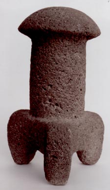 Hongo tallado de base trípode. En la parte superior del sombrero lleva un agujero en el centro, y en el cuerpo del hongo un rostro tallado, que casi no se puede distinguir.