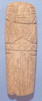 Camahuil antropomorfo tallado en piedra. Técnica: tallado. Leva ojos ovalados, manos sobre el pecho, en la cintura una banda con diseños entretejidos. Lleva inciso un triángulo que se une con una línea vertical que divide en dos la parte inferior.