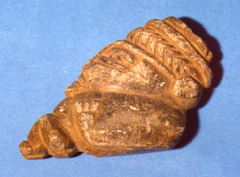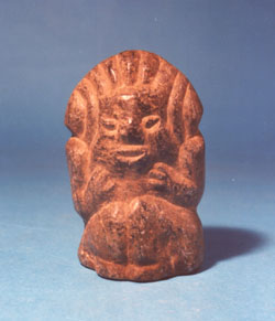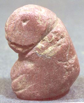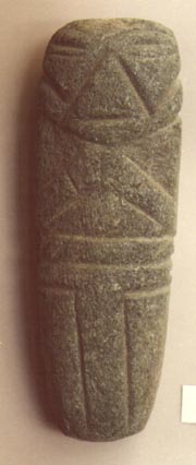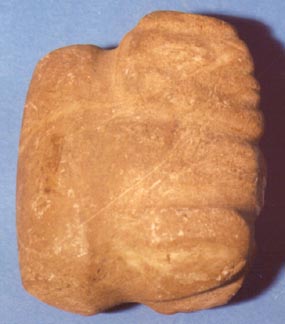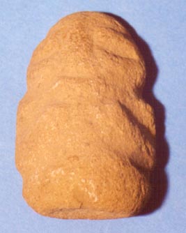 Camahuil antropomorfo tallado en piedra. Técnica: tallado, inciso. Tiene ojos alargados, vientre abultado y la parte inferior redondeada.