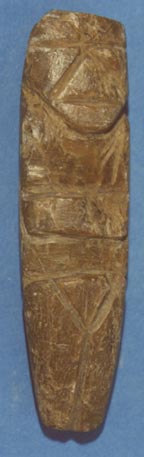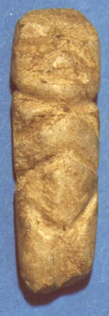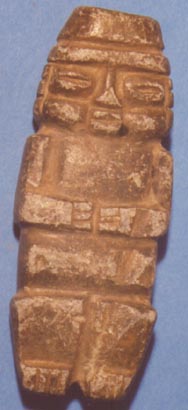 Camahuil antropomorfo tallado en piedra micácea. Técnica: tallado, inciso. Lleva ojos hendidos, nariz triangular, manos sobre el pecho formando un rombo con dos incisiones en la parte inferior.